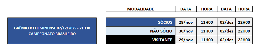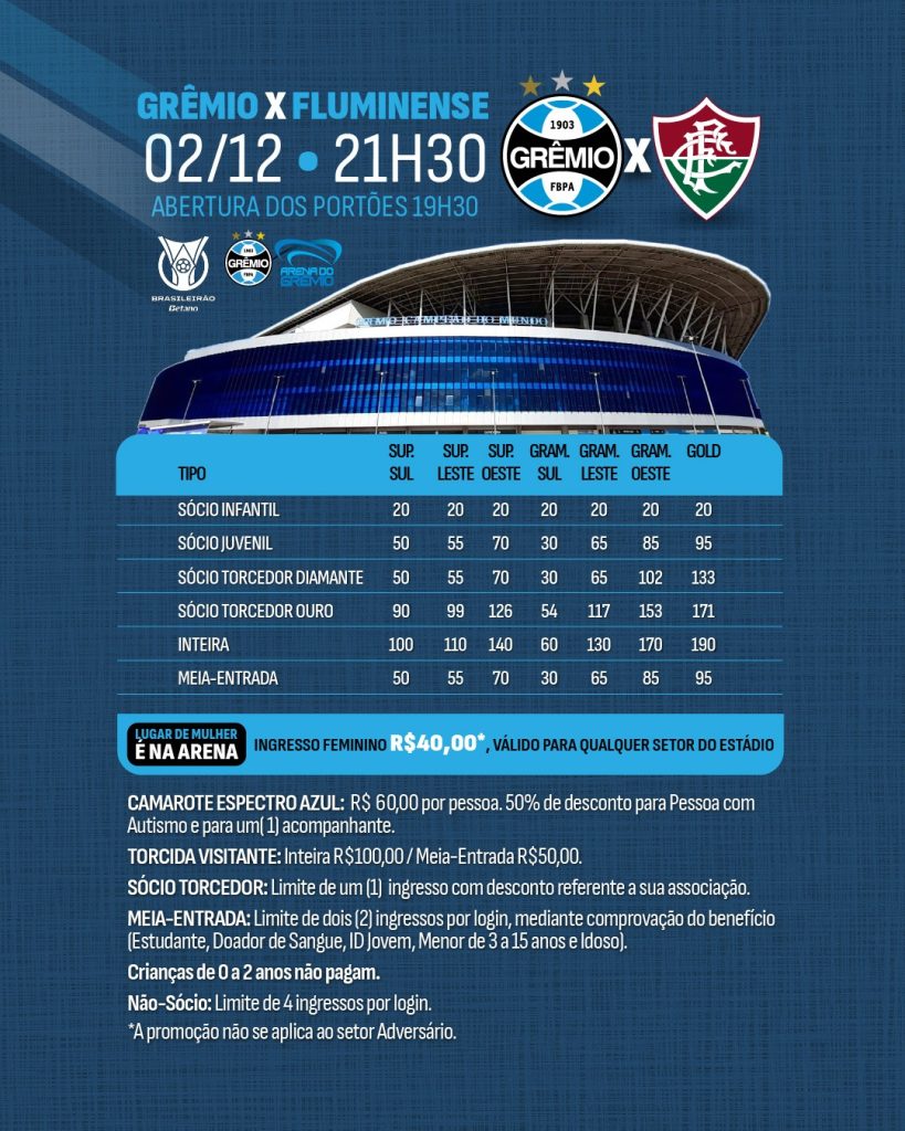 Em partida válida pela 37° rodada do campeonato brasileiro, o Grêmio recebe o Fluminense na Arena, na terça-feira (2) às 21h30. As vendas terão início nesta sexta-feira (28), às 11h, exclusivamente para sócios, no site arenapoa.com.br. Para não-sócio, as vendas estarão disponíveis a partir de domingo (30), às 11h, pelo site da Arena.